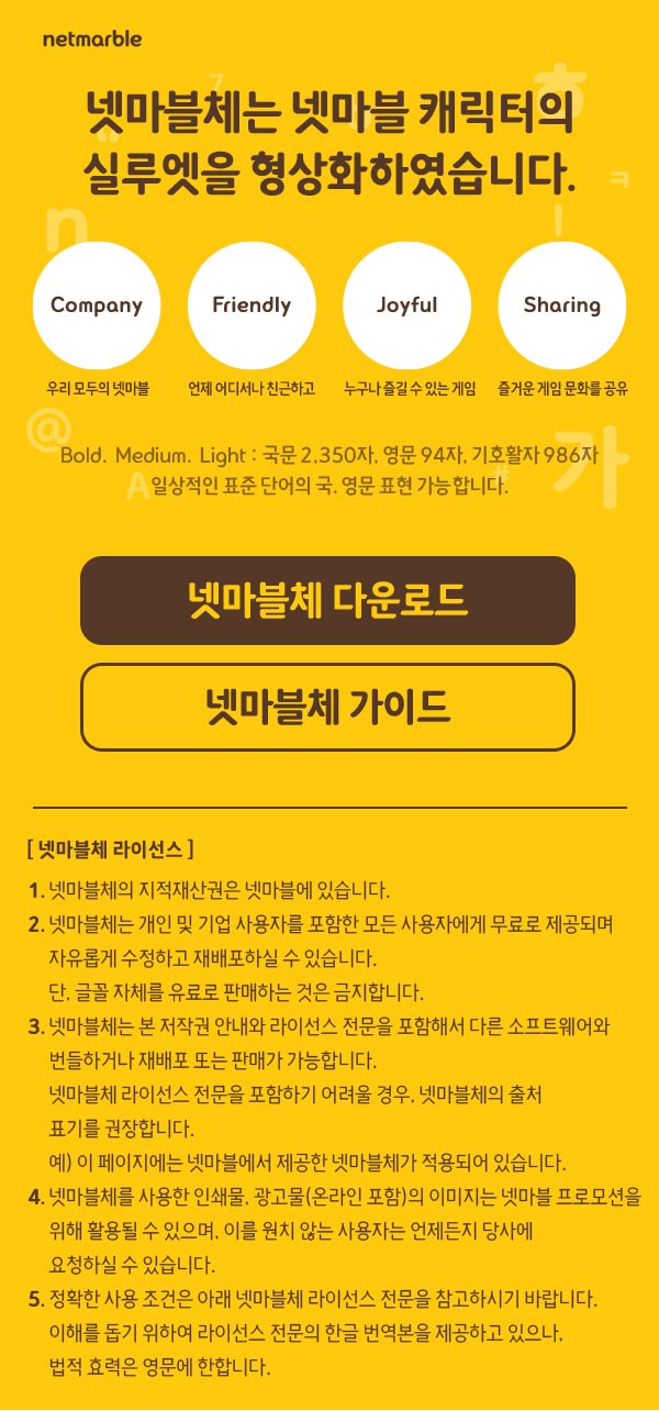 netmarble 넷마블체는 넷마블 캐릭터의 실루엣을 형상화하였습니다. Company 우리모두의 넷마블 Friendly 언제 어디서나 친근하고 Joyful 누구나 즐길 수 있는 게임 Sharing 즐거운 게임 문화를 공유 Bold. Medium. Light : 국문 2,350자. 영문 94자, 기호활자 986자 일상적인 표준 단어의 국.영문 표현 가능합니다.